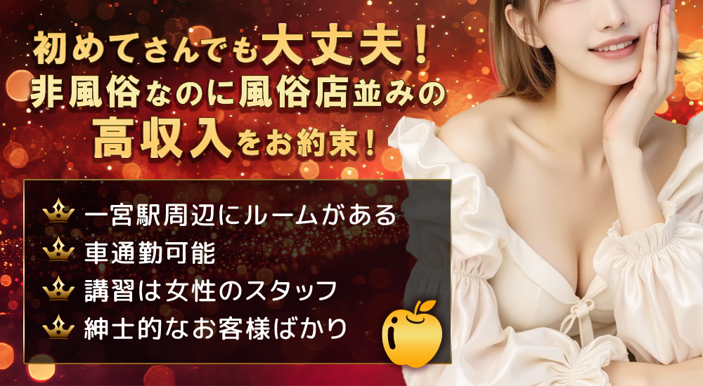 | 当店について | 18歳から50歳くらいまでの健康で明るい方を大歓迎しておりますので、ぜひご応募ください。 掛け持ちOK 交通費支給 全額日払い 名鉄一宮駅から徒歩圏内に位置しており、高収入を得ることができるサロンです。 また、出勤時間についても、10時から翌2時の間でお好きな時間帯をご相談いただけます。 当店では厚生費などの負担は一切ございませんし、ルーム泊も可能です。また、遅い時間にお仕事が終わる場合には送りもご用意しております。 |